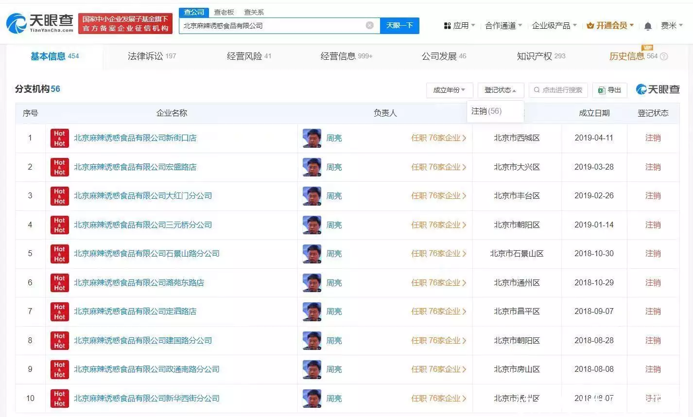 天眼风险信息显示,北京麻辣诱惑食品有限公司存在30余条失信被执行人(老赖)信息、90余条限制消费令,韩东所持该公司千万股权也已被冻结。分支机构信息显示,该公司50余家分公司及门店均已注销。此外,其投资的5家企业中,天津热辣食品有限公司、上海嗨享生活品牌管理有限公司为存续状态,2公司也均已被列为失信被执行人(老赖)并被限制高消费。