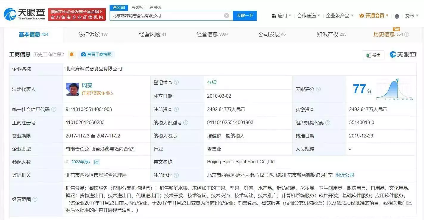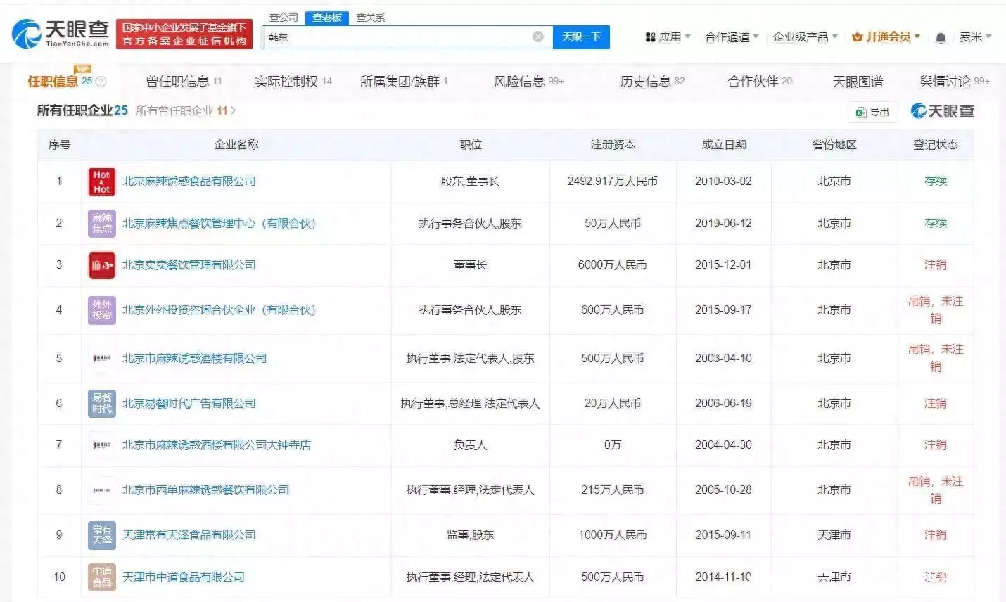 天眼查App显示,韩东关联的20余家企业中,处于存续状态的仅有北京麻辣诱惑食品有限公司、北京麻辣焦点餐饮管理中心(有限合伙),其余均为被吊销或者注销状态。其中,北京麻辣诱惑食品有限公司成立于2010年3月,法定代表人为周亮,注册资本约2492.9万人民币,由韩东、西藏榕安成长投资中心(有限合伙)、北京外外投资咨询合伙企业(有限合伙)、周亮等共同持股。